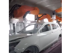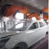 2、中途站為1K水性漆,配置4臺外噴機器人,內噴站則配置7臺機器人,在汽車內外都噴涂一遍成膜
